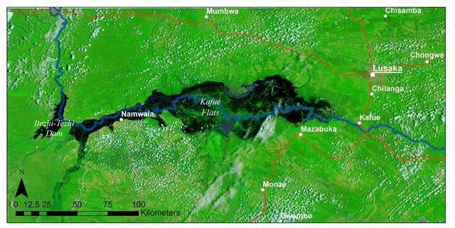 The Kafue Flats are a vast area of swamp, open lagoon and seasonally inundated flood-plain on the Kafue River in the Southern, Central and Lusaka provinces of Zambia. They are a shallow flood plain 240 km long and about 50 km wide, flooded to a depth of less than a meter in the rainy season and drying out to a clayey black soil in the dry season.