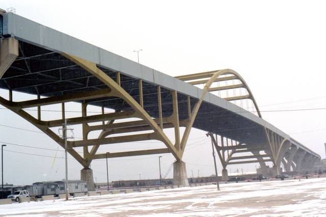 Its unfinished state was used as the site of a car chase scene in the movie The Blues Brothers. Eventually, the bridge connections were completed in 1998, when the Lake Parkway (Wisconsin Highway 794) opened between the bridge's southernmost exit, connecting the bridge between the Bay View neighborhood and downtown Milwaukee's southeastern tip.