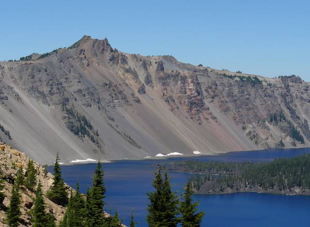 Mazama's summit was destroyed by a volcanic eruption that occurred around 5677 BC, ± 150 years. The eruption reduced Mazama's approximate 12000ft height by about 1mi. Much of the volcano fell into the volcano's partially emptied neck and magma chamber. At 8159ft, Hillman Peak is now the highest point on the rim.