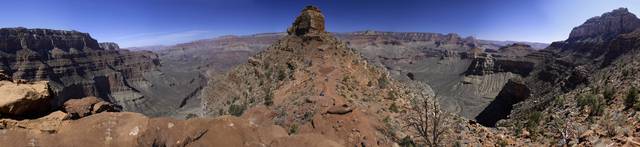 Slightly steeper than the Bright Angel trail, this trail starts from Yaki Point and follows a ridgeline into the canyon. Because the trail follows a ridge the views are spectacular and wide-open, but the amazing scenery comes at a cost: there is almost no shade to protect hikers from the sun, and the lack of natural water sources means that there is less plant and animal life. Hikers should be aware that there is no water available along this trail and prepare for brutal conditions- summer hikes can be particularly dangerous. Round-trip distances to waypoints are: Cedar Ridge (3.0 mi / 4.8 km with 1140 ft / 348 m of elevation change), Skeleton Point (6.0 mi / 9.6 km with 2040 ft / 622 m of elevation change), The Tipoff (8.8 mi / 14.2 km with 3260 ft / 994 m of elevation change), Bright Angel Campground (14 mi / 22.6 km with 4780 ft / 1457 m of elevation change).