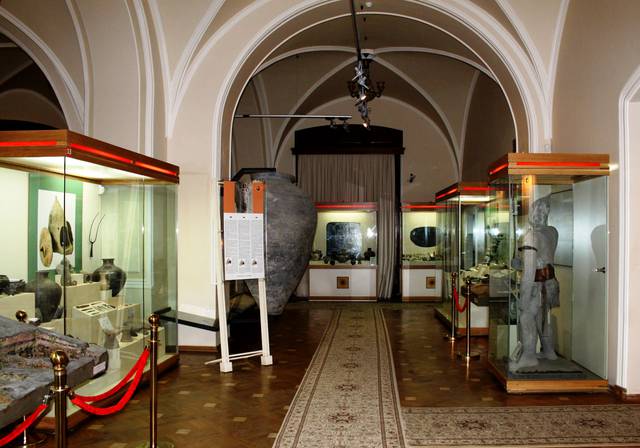 The building of the Museum was built in 1893–1902. The Italian Renaissance-style mansion is immense and takes up an entire city block. There are four floors in some parts of the building. It was designed by Polish architect Józef Gosławski. On the second floor of Taghiyev's residence, side by side there are two major ballrooms. One is based on Oriental designs (Mauritanian) style and the other, on Occidental design. The Oriental Room has enormous plate glass windows, gilded arches, highly ornamental walls, ceilings and chandeliers. The lines in the Occidental Room are more perpendicular to each other – rectangular. The museum has more than 2000 exhibits and includes the following departments:Modern history, Ethnography, Ancient and medieval history of Azerbaijan, Scientific excursion, Fund of Numismatics, Art design group.