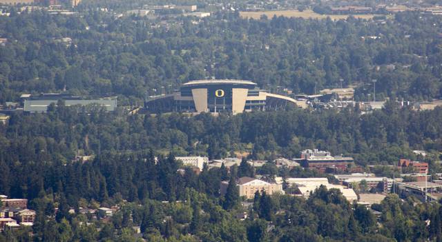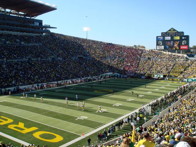 Autzen Stadium is an outdoor football stadium in the northwest United States, in Eugene, Oregon. Located north of the University of Oregon campus, it is the home field of the Oregon Ducks of the Pac-12 Conference. Opened in 1967, the stadium has undergone several expansions. The official capacity is 54,000.