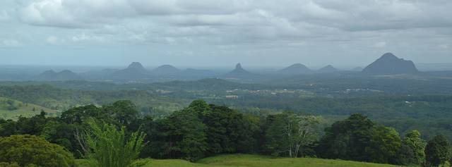 The Glass House Mountains are a group of eleven hills that rise abruptly from the coastal plain on the Sunshine Coast, Queensland, Australia. The highest hill is Mount Beerwah at 556 meters above sea level, but the most identifiable of all the hills is Mount Tibrogargan which from some directions appears to be a face staring out to sea. Mt Ngungun is a sub volcanic mountain. This means Mount Ngungun is a sub volcanic rock also known as a Hypabyssal Rock. It is an intrusive rock that is emplaced at medium to shallow depths within the crust, and has intermediate grain size and often Porphyritic texture between that of Volcanic and Plutonic rocks. Mount Ngungun and the Glass House Mountains are located near Beerburrum State Forest and Old Gympie Road. From Brisbane, follow the Bruce Highway north, take the Glass House Mountains tourist drive turn-off and follow the signs to the Glass House Mountains. The trip is about one hour and eleven minutes from Brisbane. The Volcanic peaks of the Glass House Mountains rise dramatically from the surrounding Sunshine Coast landscape. They were formed by intrusive plugs, remnants of volcanic activity that occurred 25-27 million years ago. Molten rock filled small vents or intruded as bodies beneath the surface and solidified into land rocks. Millions of years of erosion have removed the surrounding exteriors of volcanic cores and softer sandstone rocks.