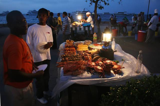 The Gardens are especially crowded after sunset, when tourists and local alike gather in a popular food street market in the main square, to have dinner eating Swahili and Zanzibari cuisine delicacies such as grilled seafood, samoosas, cassava and sweet potatoes.