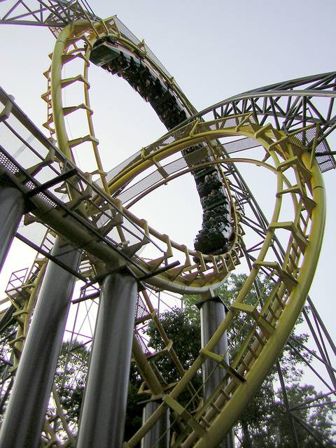 The Loch Ness remains the only roller coaster with two interlocking loops — other similar designs having been dismantled. In addition to the loops, which link over one of the park's water features, the design includes a helix tunnel, two lift hills and a 114ft drop. The ride sits within the park's Scottish-themed Heatherdown, relates the legend of the Loch Ness monster and suggests the serpent inhabits its underwater caves.